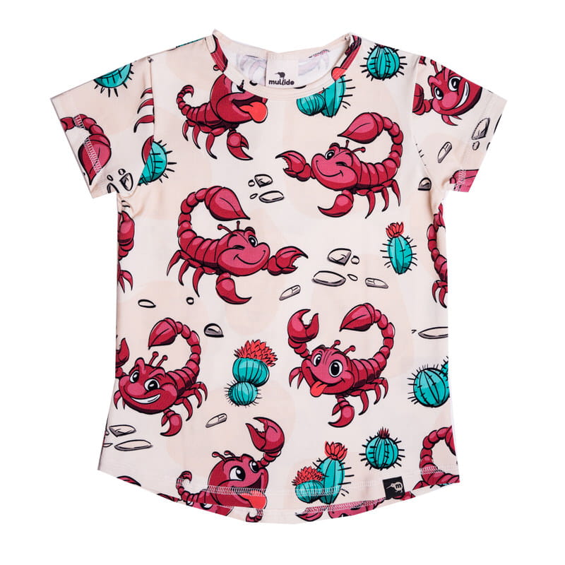 Absolutny must-have każdej dziecięcej szafy! Lekki i wygodny t-shirt, delikatnie zaokrąglony na dole i przedłużony z tyłu. Wykonany z elastycznego jerseyu. Idealny kompan naszych szortów, spodni i legginsów!