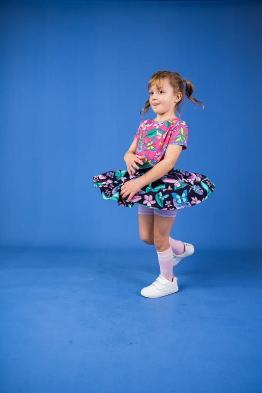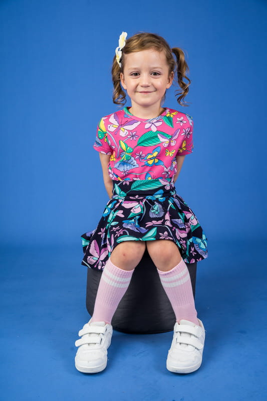 Absolutny must-have każdej dziecięcej szafy! Lekki i wygodny t-shirt, delikatnie zaokrąglony na dole i przedłużony z tyłu. Wykonany z elastycznego jerseyu. Idealny kompan naszych szortów, spodni i legginsów!