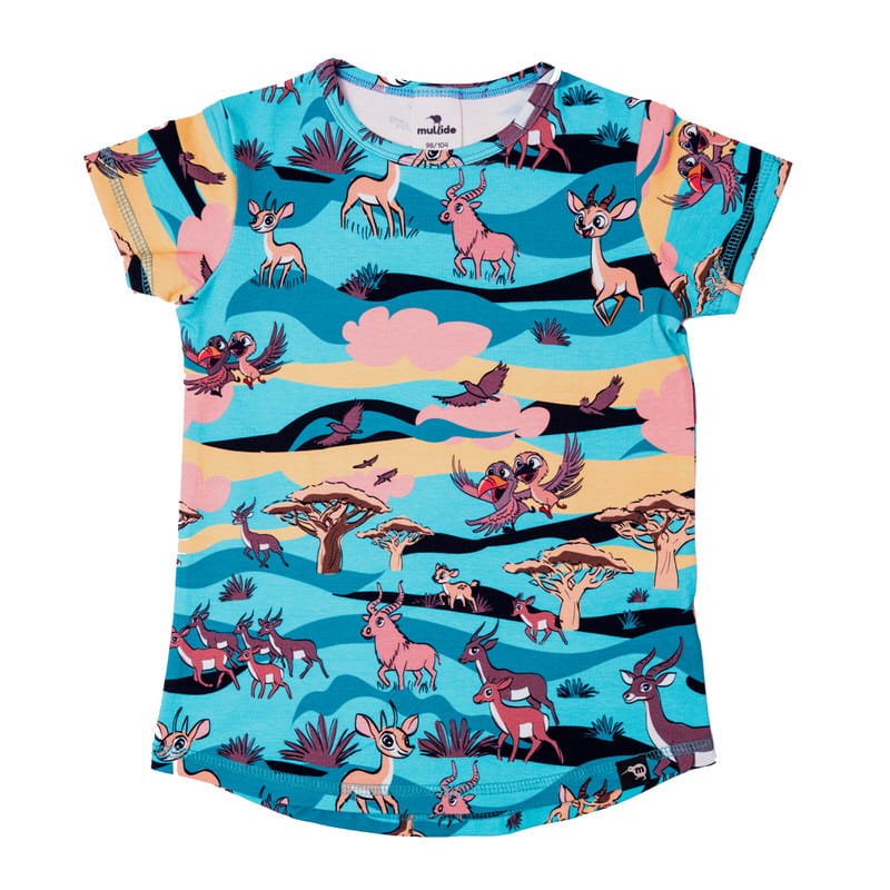 Absolutny must-have każdej dziecięcej szafy! Lekki i wygodny t-shirt, delikatnie zaokrąglony na dole i przedłużony z tyłu. Wykonany z elastycznego jerseyu. Idealny kompan naszych szortów, spodni i legginsów!