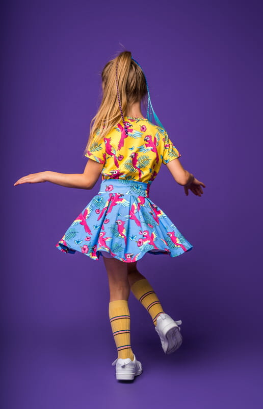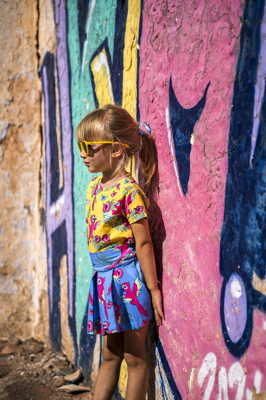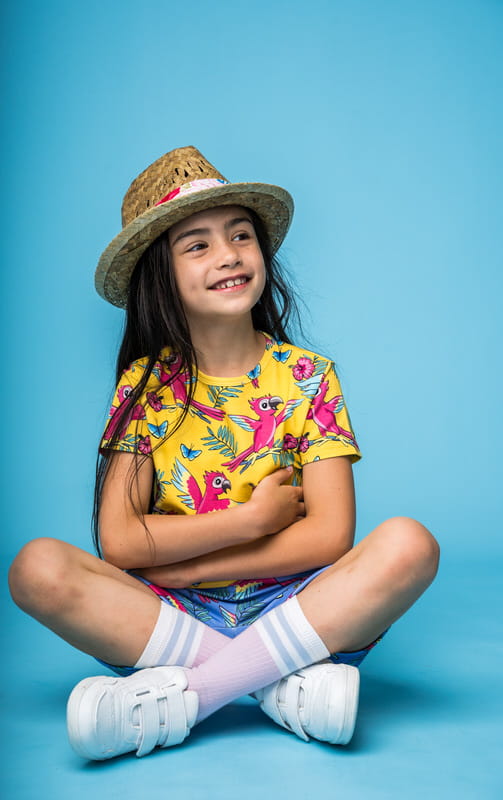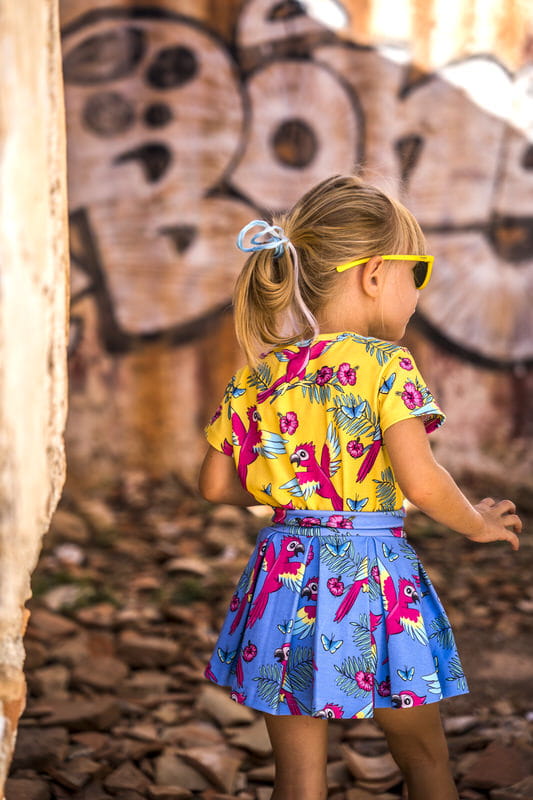 Absolutny must-have każdej dziecięcej szafy! Lekki i wygodny t-shirt, delikatnie zaokrąglony na dole i przedłużony z tyłu. Wykonany z elastycznego jerseyu. Idealny kompan naszych szortów, spodni i legginsów!
